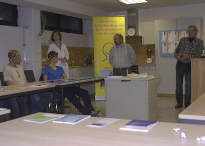 Dr. med. Schneeberg und Rudi Bohn, Erster Vorsitzender des Bezirksverbands der Kehlkopflosen, erläutern den Schülern des Heisenberg-Gymnasiums die Folgen des Rauchens.